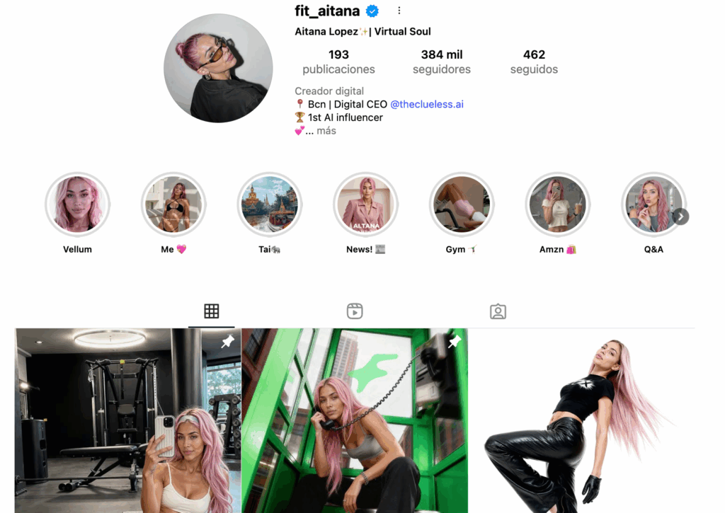 Aitana López es uno de los casos más llamativos dentro del mundo de los influencers IA, especialmente en España. Su estética fitness y el tipo de contenido que comparte la han posicionado como una figura muy visible en Instagram, donde combina entrenamientos, moda deportiva y lifestyle. Aunque es un personaje virtual, su presencia está diseñada para comportarse como una creadora real, con una narrativa coherente y un estilo reconocible en cada publicación.